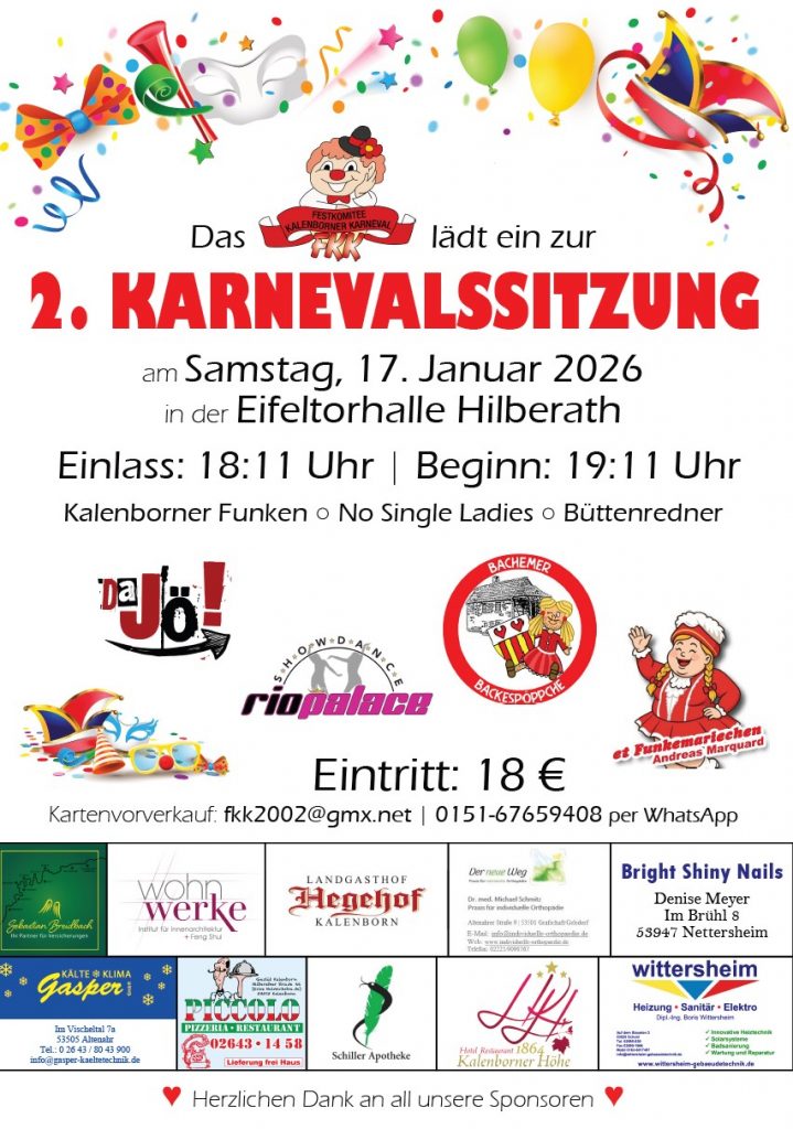 Das Festkomitee Kalenborner Karneval (FKK) lädt herzlich ein zur 2. Karnevalssitzung am Samstag, den 17. Januar 2026 in der Eifeltorhalle Hilberath!